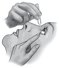 4. Trekk ned nedre øyelokk, se opp og klem på beholderen slik at en dråpe faller ned i øyet.