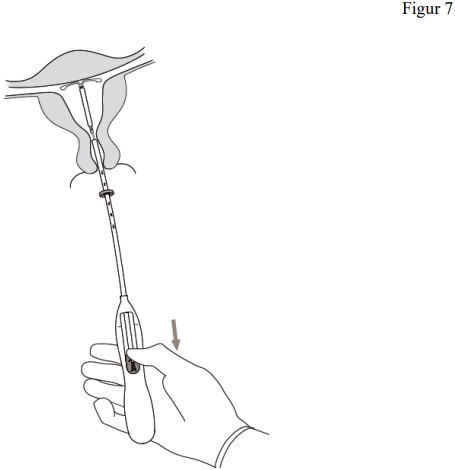 7. Mens du holder innføringshylsen på plass, frigjøres Kyleena ved å skyve glideknappen helt tilbake (figur 7). Mens du fortsatt holder glideknappen helt tilbake, fjernes innføringshylsen forsiktig ved å trekke den ut. Kutt trådene slik at 2-3 cm er synlig utenfor cervix.