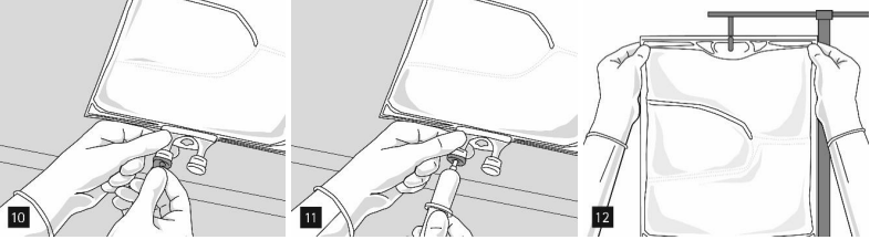 Fjern aluminiumsfolien (figur 10) fra infusjonsporten og fest den til infusjonssettet (figur 11). Bruk et ikke-ventilert infusjonssett eller steng luftinntaket på et ventilert sett. Heng posen på et infusjonsstativ (figur 12) og utfør infusjonen ved bruk av standard infusjonsteknikk.