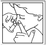 Hold sprayflasken som vist på bildet. Bøy hodet lett framover. Hold for det ene neseboret og sett sprayflasken i det andre.