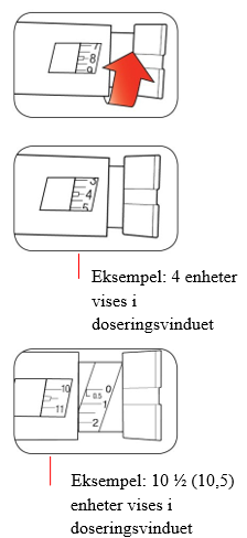 Pennen stilles med en halv enhet (0,5 enheter) av gangen. Du kan injisere fra 0,5 enheter til 30 enheter i én enkelt injeksjon.