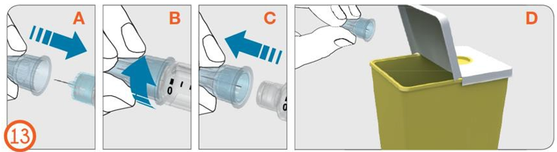 Skru løs kanylen fra pennen ved å vri mot klokken (se figur 13B og figur 13C).