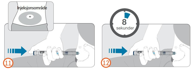 Å holde injeksjonsknappen inne i 8 sekunder tillater at hele dosen blir injisert og absorbert under huden.