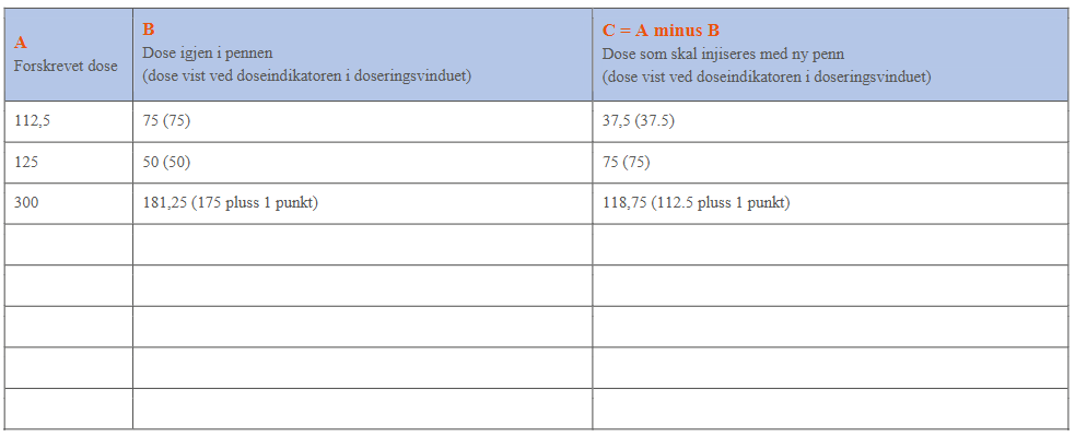 Injiser resterende dose av legemidlet (tallet i kolonne C) med en ny penn for å få full forskrevet dose.