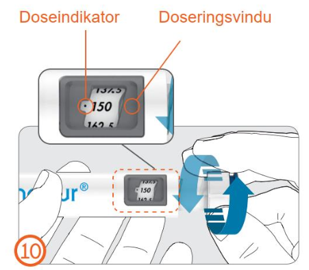 Skru dosevelgeren med klokken inntil forskrevet dose kommer på linje med doseindikatoren i doseringsvinduet.