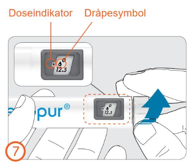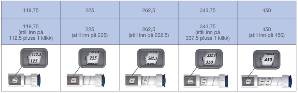 Dersom du ikke får stilt inn full dose, betyr det at det ikke er nok legemiddel igjen i pennen. Du må da sette dosen som to injeksjoner ved å bruke to penner, eller kaste pennen du har i bruk og ta i bruk en ny penn til injeksjonen.