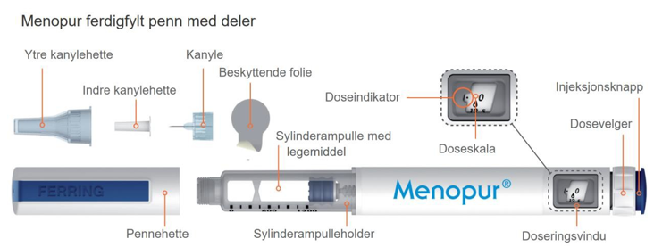 Menopur settes som en injeksjon rett under huden (subkutant), normalt i mageområdet. Den ferdigfylte pennen kan brukes til flere injeksjoner.