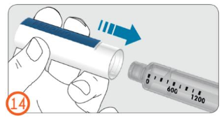 Dersom det etter fem forsøk fortsatt ikke har kommet noen dråpe, må kanylen fjernes (se steg 13), en ny kanyle settes på (se steg 3-6) og klargjøringen (se steg 7-9) gjentas.