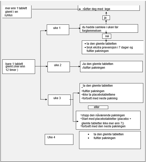 Dersom du er mer enn 12 timer for sent ute med å ta en tablett kan p-pillens sikkerhet være redusert. Jo flere tabletter du glemmer på rad jo høyere er risikoen for at den preventive effekten reduseres. Det er spesielt høy risiko for å bli gravid dersom du glemmer store (aktive) tabletter på begynnelsen eller i den tredje uken (uken før du begynner med de små tablettene). Derfor må du følge de reglene som angis nedenfor (se også diagrammet under).