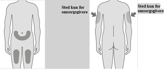 Ikke injiser på andre steder på kroppen. Ikke injiser i områder som er ømme, røde eller harde, flasser av eller har blåmerker. Ikke injiser i føflekker, arr eller strekkmerker. Ikke injiser gjennom klærne. |