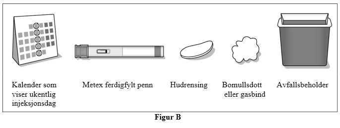 Metex ferdigfylt penn skal kun injiseres én gang i uken, og alltid på same ukedag. Du må ikke injisere eller håndtere legemidlet hvis du er gravid.
