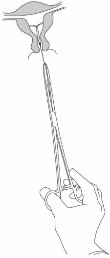 Sett inn et speculum slik at cervix gjøres synlig. Rengjør cervix og vagina grundig med en egnet antiseptisk oppløsning.