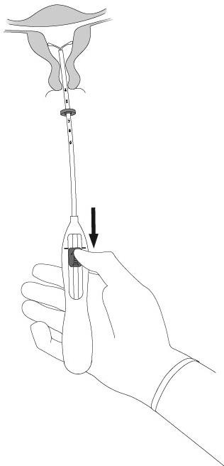 7. Mens du holder innføringshylsen på plass, frigjøres Mirena ved å skyve glideren helt tilbake (Figur 7). Mens du fortsatt holder glideren helt tilbake, fjernes innføringshylsen forsiktig ved å trekke den ut. Kutt trådene slik at 2-3 cm er synlig utenfor cervix.