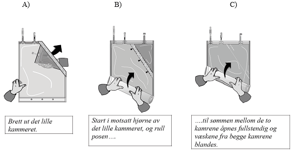 Etter blanding av begge kamrene, må det kontrolleres om sømmen mellom kamrene er fullstendig åpnet, at væsken er klar og uten farge og at posen ikke lekker.