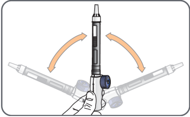 9. Hold blandeutstyret med den påmonterte sylinderampullen med kanylen pekende oppover, og beveg omtrent 10 ganger forsiktig fra side til side (fra «kl. 9»-posisjon til «kl. 3»-posisjon) for å løse opp pulveret i sylinderampullen.