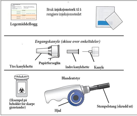Merk: Injeksjonstørk, injeksjonskanyler og beholderen for skarpe gjenstander er ikke inkludert i pakningen.
