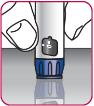 3. Trykk på injeksjonsknappen. Du bør se «0» på linje med hakket i doseringsvinduet. Hvis du ikke ser «0» på linje med hakket trykker du på injeksjonsknappen til den er på linje.