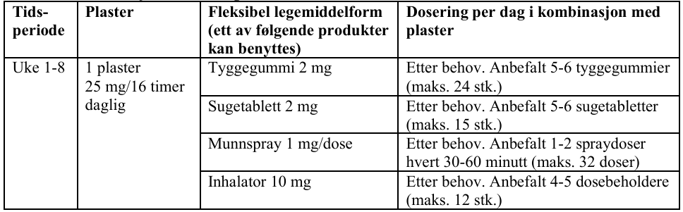 Du slutter helt med å bruke plaster etter de første 8 behandlingsukene. Reduser gradvis antall tyggegummier, sugetabletter, munnspraydoser eller inhalator dosebeholdere i inntil 1 år fra behandlingsstart.
