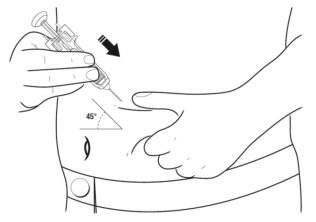12. Hold den ferdigfylte sprøyten med den andre hånden, slik du ville holdt en blyant. Beveg sprøyten raskt som en «pil» for å stikke nålen i omtrent 45º vinkel inn i huden, som vist.