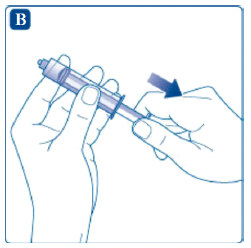 Hold sprøyten med hetteglasset med oppløsningsvæske opp ned. Dra i stempelet for å trekke oppløsningsvæsken inn i sprøyten.