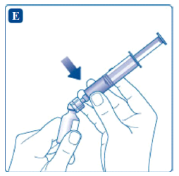 Klikk hetteglassadapteren, som fremdeles er festet til sprøyten, på hetteglasset med pulver. Hold sprøyten litt på skrå med hetteglasset vendt nedover. Skyv stempelet sakte for å injisere oppløsningsvæsken inn i hetteglasset med pulver. Pass på at strålen med oppløsningsvæske ikke rettes direkte på pulveret, da dette vil forårsake skumming.
