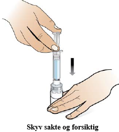 Skyv svært sakte og forsiktig ned på stempelet for å injisere alt vannet fra sprøyten til hetteglasset. Vannet må strømme sakte ned på pulveret.