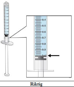 Pass på at toppen av stempelhodet kommer på linje med sprøytemarkeringen for forskrevet dose. Om nødvendig skyver du væske tilbake i hetteglasset for å få riktig dose.