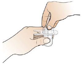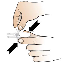 Trinn 3b: Hold i sprøyten med den ene hånden, og bøy spissen på det hvite plastdekslet ned med den andre hånden. Dette bryter forseglingen til det hvite plastdekslet.