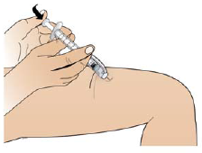 Ta forsiktig tak med den ene hånden rundt det rengjorte området av huden og hold godt fast. Hold sprøyten (som en blyant) med den andre hånden i en vinkel på 45 grader i forhold til huden.