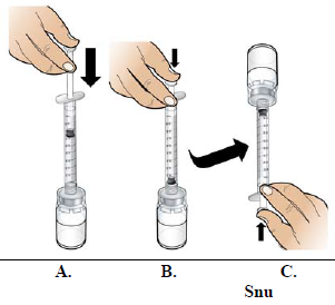 C. Snu hetteglassenheten og sprøyten opp ned, slik at hetteglasset er rett over sprøyten.