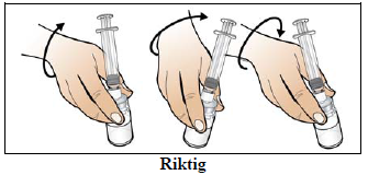 Hold området der hetteglasset og hetteglassadapteren møtes, mellom fingrene og drei hetteglasset forsiktig ved å rotere i håndleddet til alt pulveret har løst seg opp og væsken i hetteglasset er klar og fargeløs.