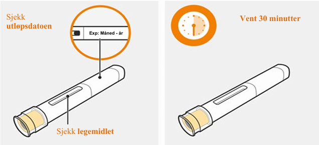 Skal ikke brukes hvis utløpsdatoen har passert. Pennen skal ikke varmes i mikrobølgeovn, varmt vann, eller direkte sollys. Skal ikke injiseres hvis oppløsningen ser grumsete eller misfarget ut, eller har partikler. Pennen skal ikke brukes hvis den har ligget utenfor kartongen i mer enn 8 timer. Hetten skal ikke fjernes på dette trinnet. |