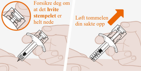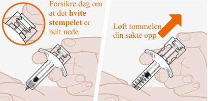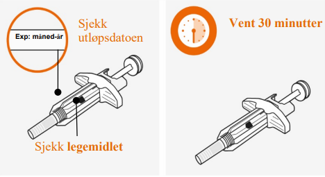 Skal ikke brukes hvis utløpsdatoen har passert. Sprøyten skal ikke varmes i mikrobølgeovn, varmt vann, eller direkte sollys. Skal ikke injiseres hvis oppløsningen ser grumsete eller misfarget ut, eller har partikler. Sprøyten skal ikke brukes hvis den har ligget utenfor esken i mer enn 8 timer. Hetten skal ikke fjernes på dette trinnet. |