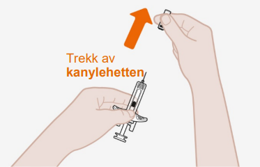 Ikke la kanylen røre noen overflater. Ikke rør kanylen. Ikke rør stempelet på dette trinnet, siden du ved et uhell kan presse ut væske og vil dermed ikke få din fulle dose. Ikke fjern noen luftbobler fra sprøyten. Ikke sett kanylehetten tilbake på sprøyten, siden det kan føre til en stikkskade. |