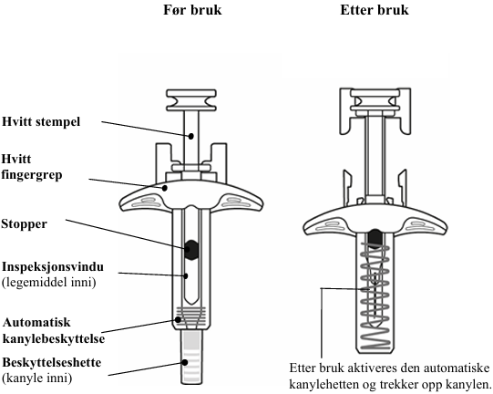 Instruksjoner for bruk av ferdigfylt sprøyte er gitt på den andre siden av dette pakningsvedlegget.