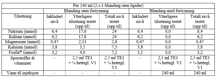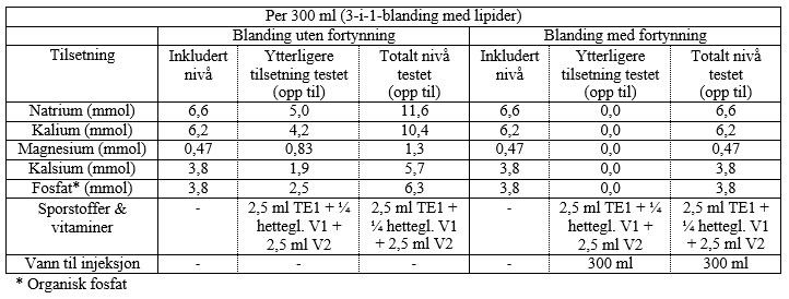Ingen tilsetninger skal gjøres til posen uten først å sjekke kompatibiliteten. Det kan resultere i dannelse av partikler eller nedbryting av lipidemulsjonen. Dette kan føre til blokkering av blodårene.