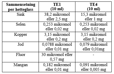 Tabellene 1-4 nedenfor viser mulige tilsetninger av kommersielt tilgjengelige oppløsninger med sporstoffer (identifisert som TE1 og TE4), vitaminer (identifisert som lyofilisat V1 og emulsjon V2) og elektrolytter i definerte mengder.