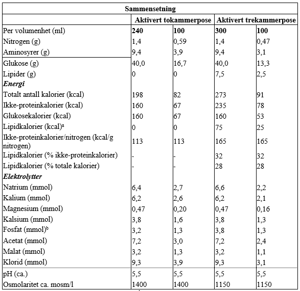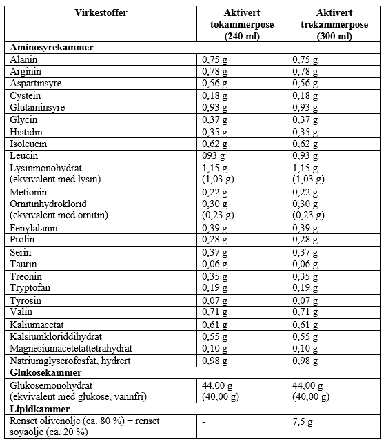 Aminosyrer, glukose og lipider (aktivert trekammerpose)