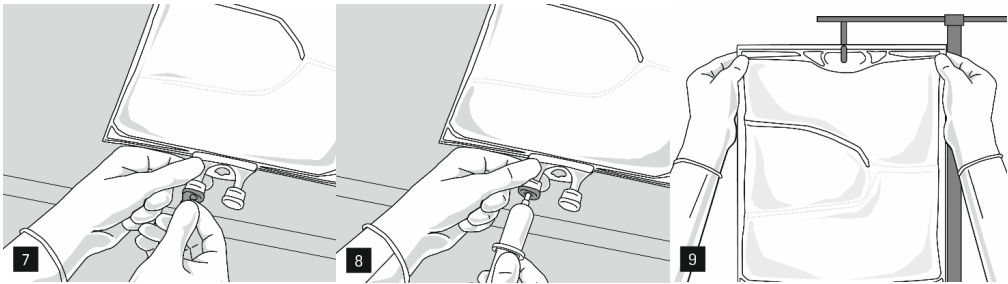 Fjern aluminiumsfolien fra infusjonsporten (figur 7) og fest den til infusjonssettet (figur 8). Bruk et ikke-ventilert infusjonssett eller steng luftinntaket på et ventilert sett. Heng posen på et infusjonsstativ (figur 9) og utfør infusjonen ved bruk av standard infusjonsteknikk.