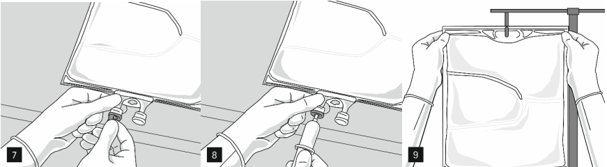 Fjern aluminiumsfolien fra infusjonsporten (figur 7) og fest den til infusjonssettet (figur 8). Bruk et ikke-ventilert infusjonssett eller steng luftinntaket på et ventilert sett. Heng posen på et infusjonsstativ (figur 9) og utfør infusjonen ved bruk av standard infusjonsteknikk.