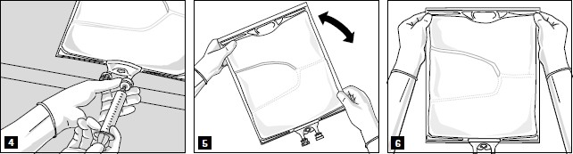 Etter at innholdet i alle kamrene er blandet og aluminiumsforseglingen er fjernet (figur 3A), kan forlikelige tilsettinger tilføres via tilsettingsporten (figur 4). Bland innholdet grundig (figur 5) og inspiser blandingen visuelt (figur 6). Blandingen er en melkehvit, homogen olje-i-vann-emulsjon. Emulsjonen skal ikke vise tegn på faseseparasjon.