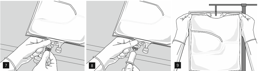 Fjern aluminiumsfolien fra infusjonsporten (figur 7) og fest den til infusjonssettet (figur 8). Bruk et ikke-ventilert infusjonssett eller steng luftinntaket på et ventilert sett. Heng posen på et infusjonsstativ (figur 9) og utfør infusjonen ved bruk av standard infusjonsteknikk.