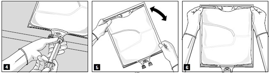 Etter at innholdet i alle kamrene er blandet og aluminiumsforseglingen er fjernet (figur 3A), kan forlikelige tilsettinger tilføres via tilsettingsporten (figur 4). Bland innholdet grundig (figur 5) og inspiser blandingen visuelt (figur 6). Blandingen er en melkehvit, homogen olje-i-vann-emulsjon. Emulsjonen skal ikke vise tegn på faseseparasjon.