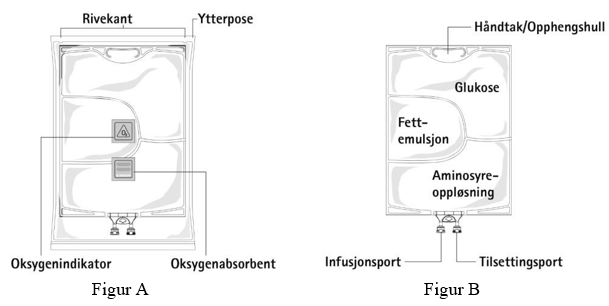 Figur A: Flerkammerposen er pakket i en beskyttende ytterpose. Mellom posen og ytterposen er det plassert en oksygenabsorbent og en oksygenindikator. Posen med oksygenabsorbent er laget av inert materiale som inneholder jernhydroksid.