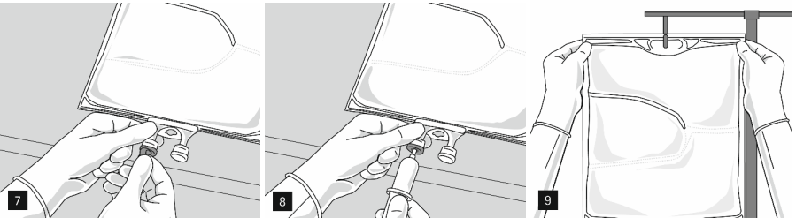 Fjern aluminiumsfolien fra infusjonsporten (figur 7) og fest den til infusjonssettet (figur 8). Bruk et ikke-ventilert infusjonssett eller steng luftinntaket på et ventilert sett. Heng posen på et infusjonsstativ (figur 9) og utfør infusjonen ved bruk av standard infusjonsteknikk.