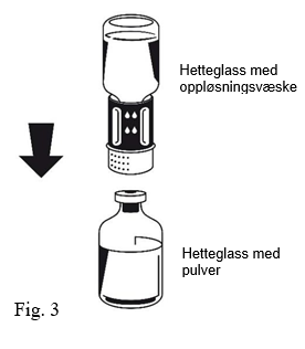 1. De uåpnede hetteglassene med henholdsvis pulver og oppløsningsvæske varmes opp til romtemperatur dersom dette er nødvendig. Denne temperaturen bør holdes under rekonstitueringen.