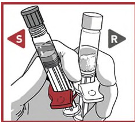 Velg sprøyten med oppløsningsvæske S med farget fingerstøtte og plasser den på TOPPEN av sprøyten med pulver R, eller tilt den forsiktig når du kobler den til.