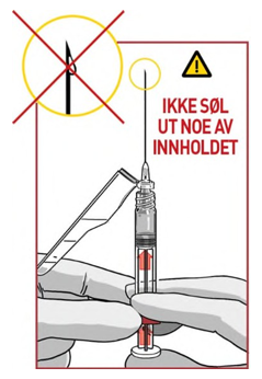 Dersom noe legemiddel er synlig på tuppen av kanyle, dra stempelet forsiktig tilbake for å unngå å søle ut legemiddel.