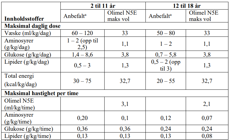 For Olimel N5E er de begrensende faktorene for de ovenfornevnte pediatriske aldersgrupper, magnesium konsentrasjon for daglig dose. I aldersgruppen 2 til 11 år er konsentrasjonene av glukose og lipid den begrensende faktoren for hastighet per time. I aldersgruppen 12 til 18 år er konsentrasjon av glukose den begrensende faktoren for hastighet per time. Dette medfører følgende inntak: