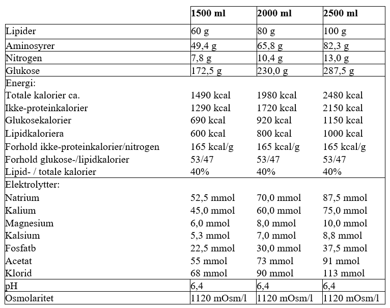 Ett kammer inneholder en glukoseoppløsning med kalsium, det andre inneholder en fettemulsjon, og det tredje inneholder en aminosyreoppløsning med andre elektrolytter.